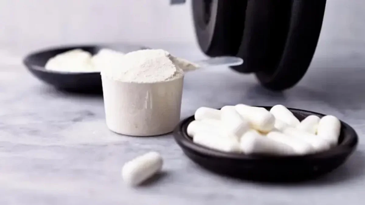 Creatina en polvo y pastillas sobre mesa